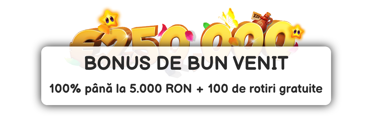 Pachetul nostru de bun venit este unul dintre cele mai generoase: până la 4.444 RON + 999 rotiri gratuite, distribuite pe primele 5 depuneri. Nu este necesar un cod promoțional – bonusul se activează automat. Cerințele de rulaj sunt de 35x pentru bonus și rotiri, explicat simplu: trebuie să pariați suma bonusului de 35 de ori înainte de retragere. Profitați acum de această ofertă.